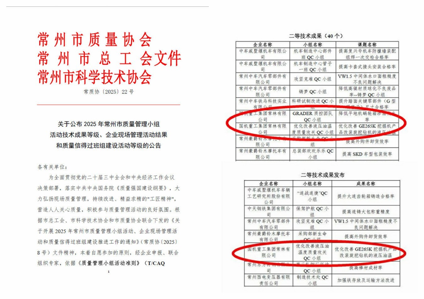 近日,常州市質(zhì)量協(xié)會正式公布2025年常州市質(zhì)量管理小組活動評選結(jié)果,常林公司申報的“降低平地機蝸輪箱滲油發(fā)生率”“優(yōu)化改善GE265K挖掘機產(chǎn)品改裝旋挖鉆機的液壓油溫”兩個QC項目從82個參選項目中脫穎而出,分別榮獲常州市質(zhì)量管理小組活動技術(shù)成果二等獎與QC小組活動技術(shù)成果發(fā)布二等獎。
